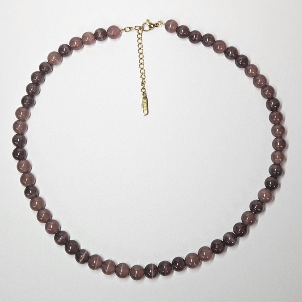 Ketting gemaakt van Cat Eye kralen. Dit zijn kralen met reflectie die vergelijkbaar is met de ogen van een kat als er licht op schijnt.