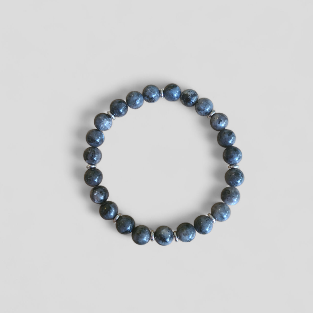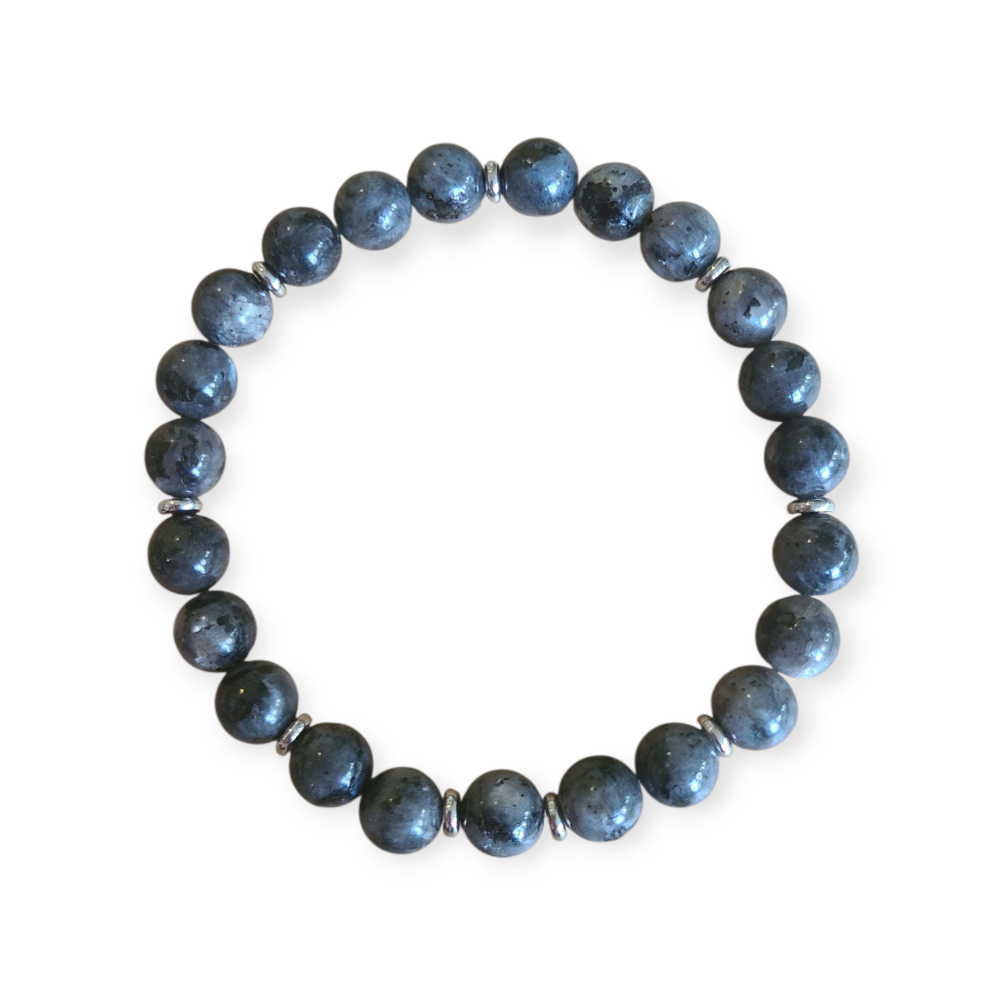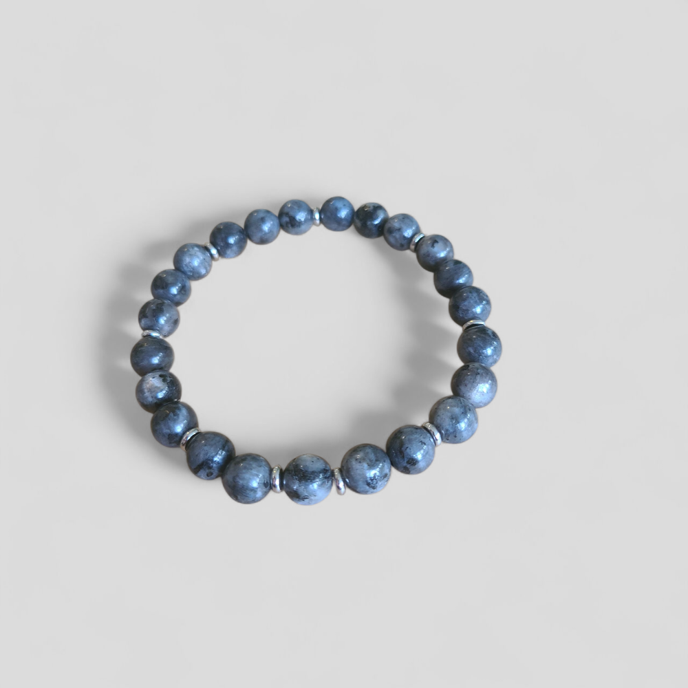 Natuurstenen armband gemengd met roestvrijstalen zilveren kralen gemaakt op een elastische band.